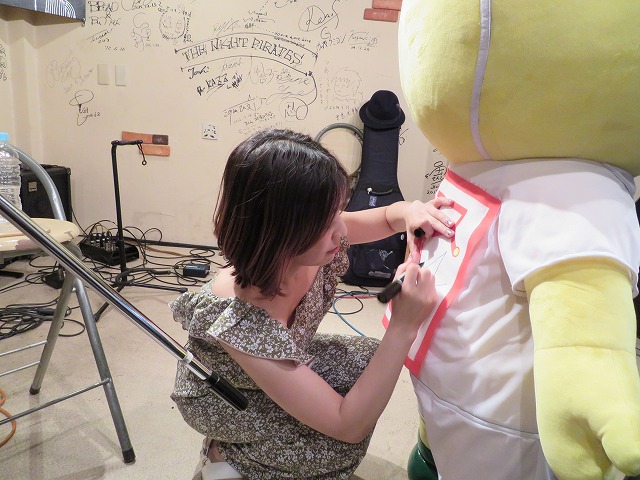 ライブハウスの壁に出演したアーティストさんのサインがいっぱい書いてあったので、Yoshimiさんにお願いしててにまるにもサインしてもらったまる!