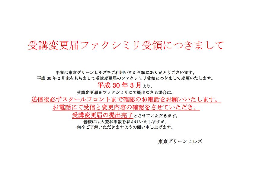 お知らせ 受講変更届ファクシミリ受領につきまして 2018.02.24 平素は東京グリーンヒルズをご利用いただき誠にありがとうございます。 平成30年2月末をもちまして受講変更届のファクシミリ受領につきまして変更いたします。 平成30年3月より、 受講変更届をファクシミリにて提出なさる場合は、 送信後必ずスクールフロントまで確認のお電話をお願いいたします。 お電話にて受信と変更内容の確認をさせていただき、 受講変更届の提出完了とさせていただきます。 皆様には大変お手数をおかけいたしますが、 何卒ご了解いただきますようお願い申し上げます。