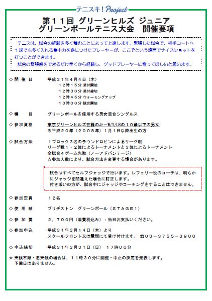 参加対象:東京グリーンヒルズ在籍のJr-W/Y/LBの10歳以下の男女
